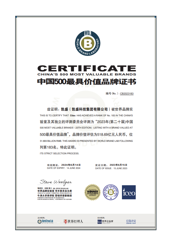 6月15日,由世界品牌实验室(World Brand Lab)主办的2023年“中国500最具价值品牌”发布会在北京举行,“凯盛”品牌首次参评,即以518.69亿元人民币的品牌价值,位列榜单183位。