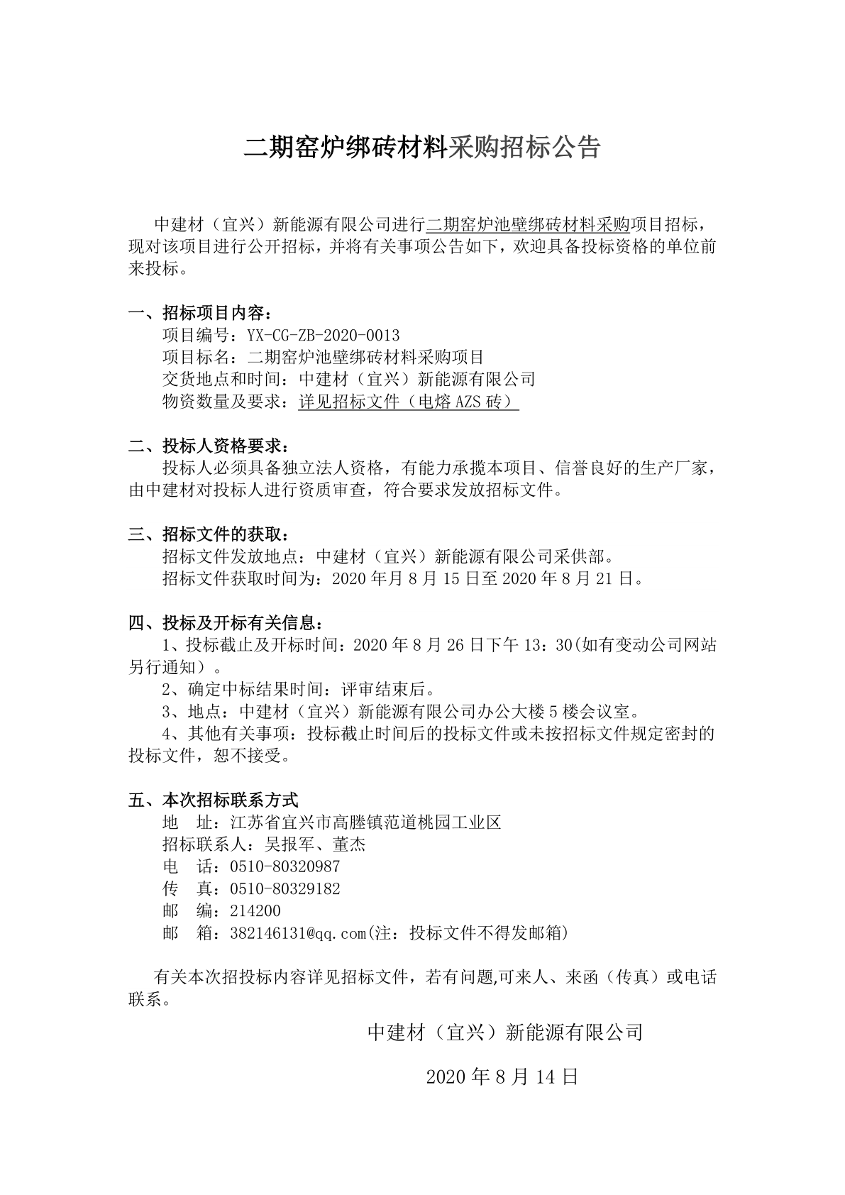 中建材(宜兴)新能源有限公司二期窑炉绑砖材料采购招标公告