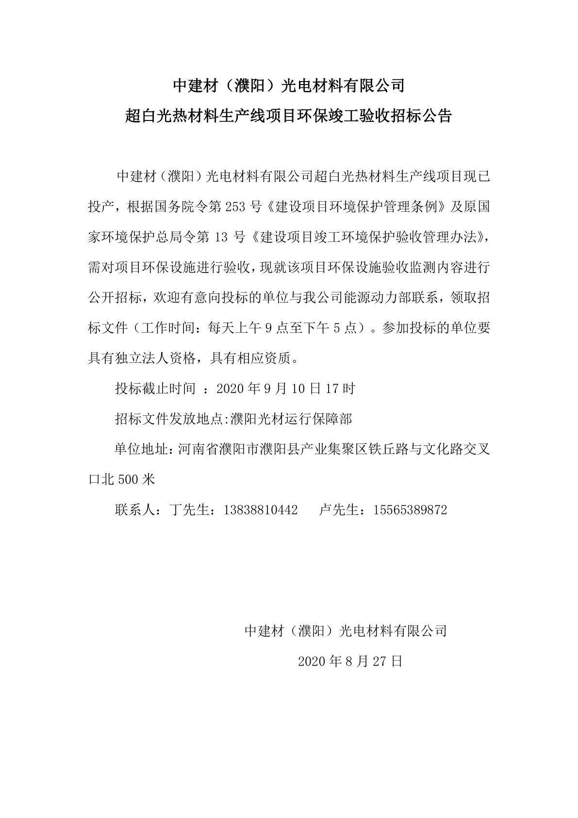 中建材(濮阳)光电材料有限公司 超白光热材料生产线项目环保竣工验收招标公告