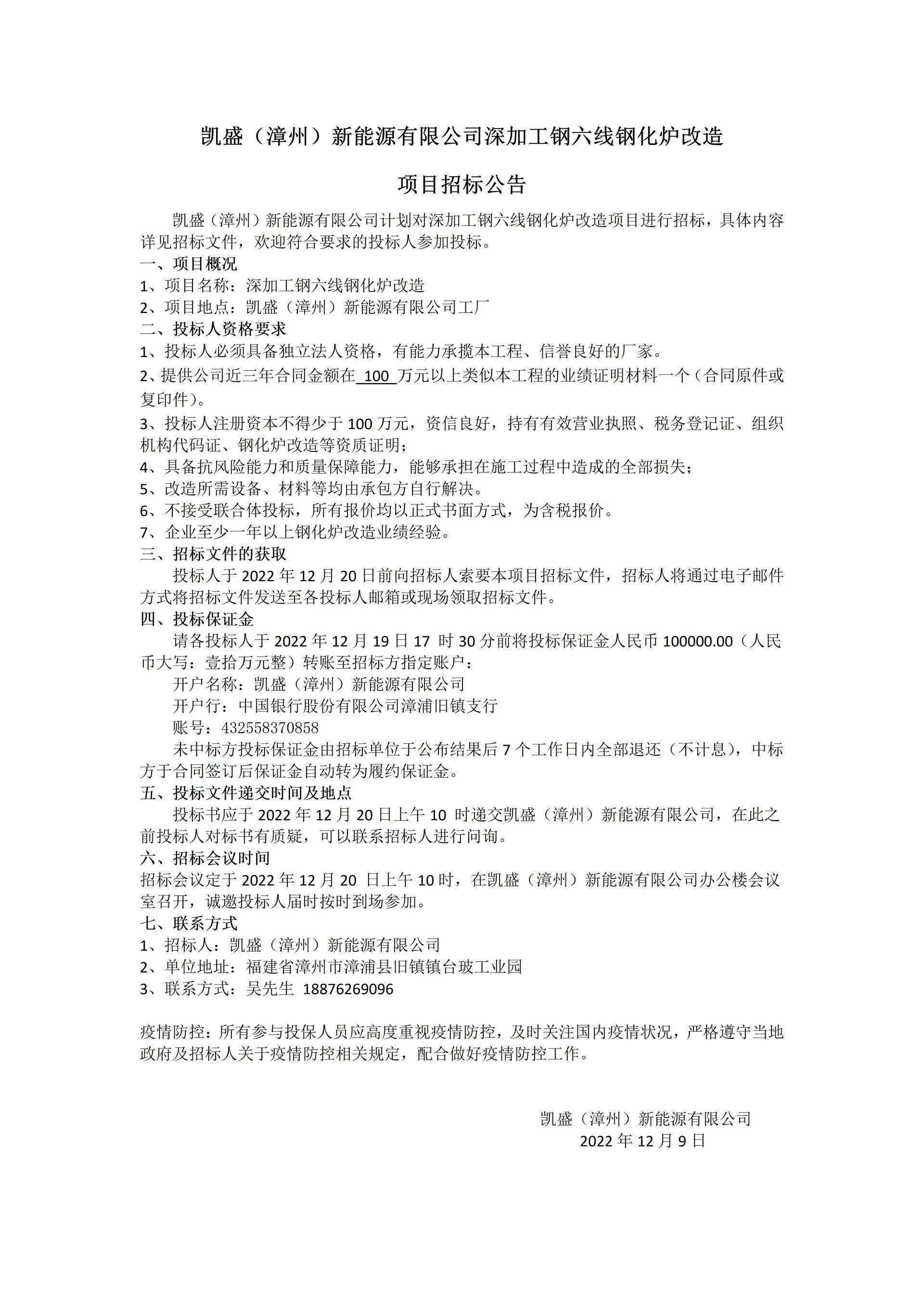 凯盛(漳州)新能源有限公司深加工钢六线钢化炉改造项目招标公告