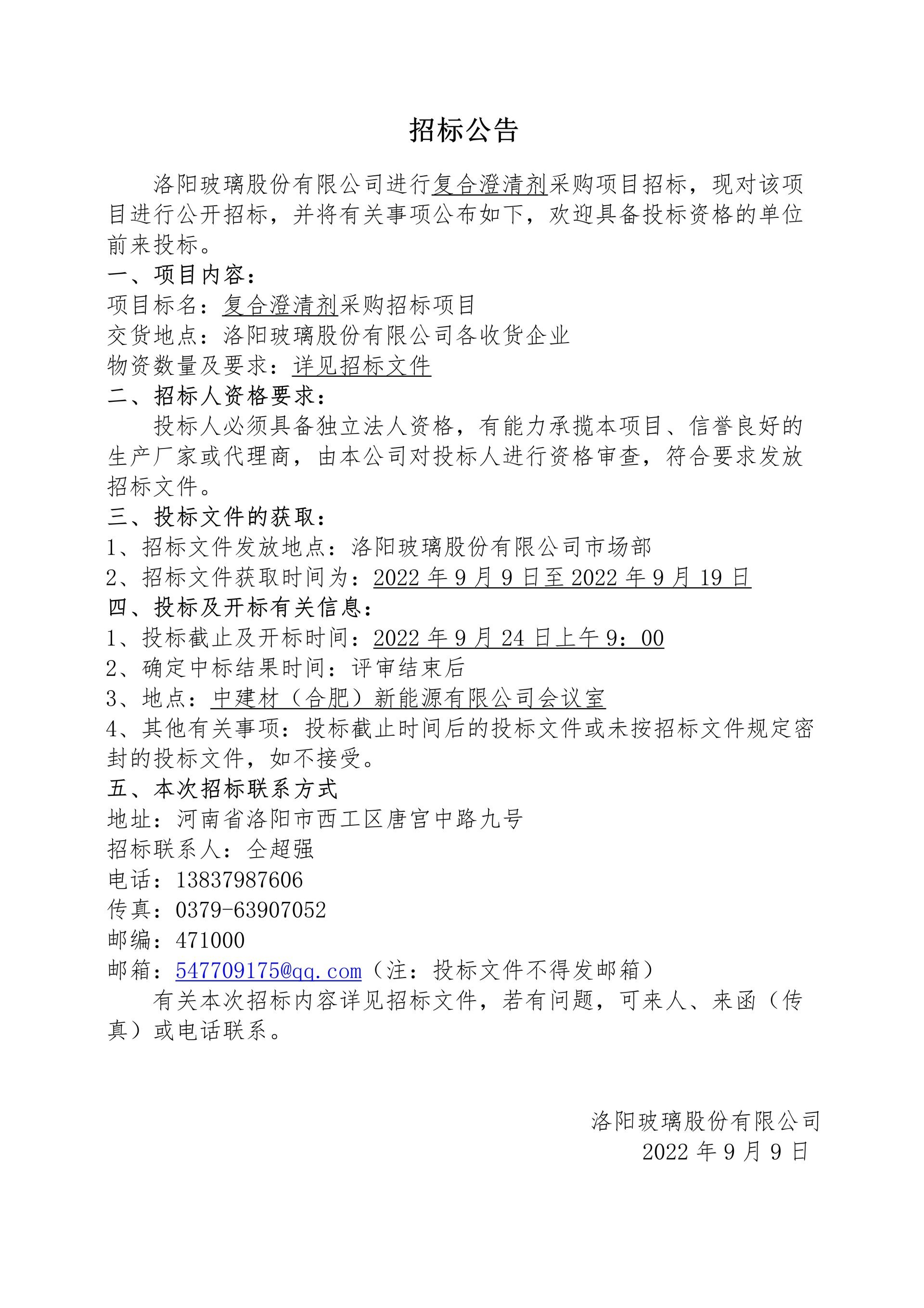 洛阳玻璃股份有限公司复合澄清剂采购项目招标公告