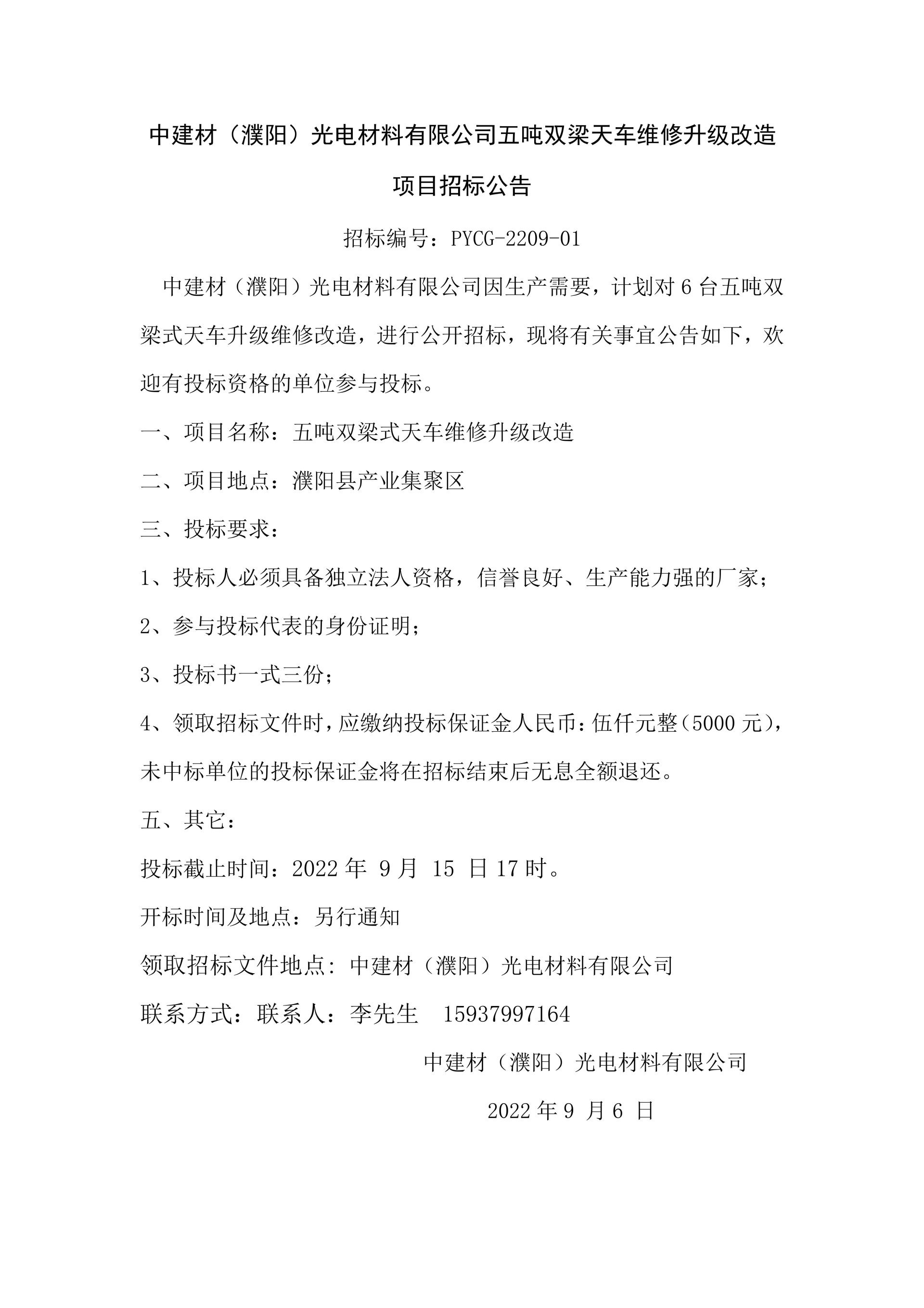 中建材(濮阳)光电材料有限公司五吨双梁天车维修升级改造项目招标公告