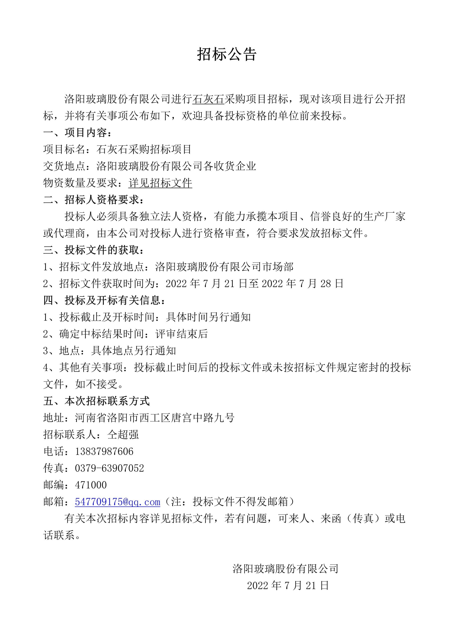 洛阳玻璃股份有限公司石灰石采购项目招标公告