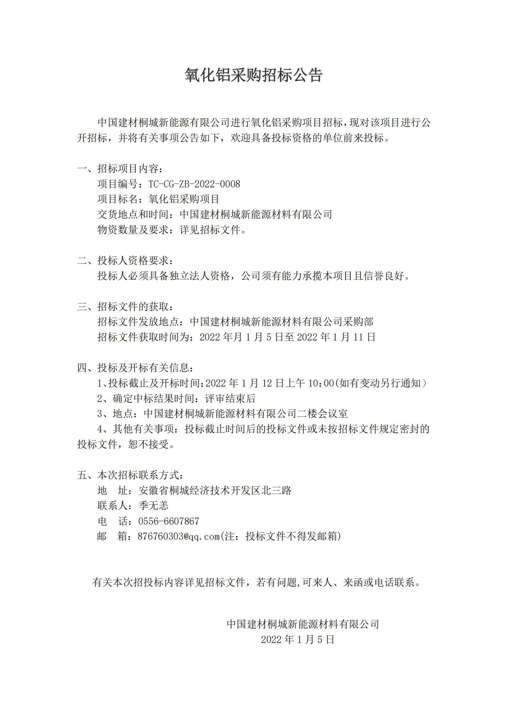 国建材桐城新能源有限公司进行氧化铝采购项目招标公告